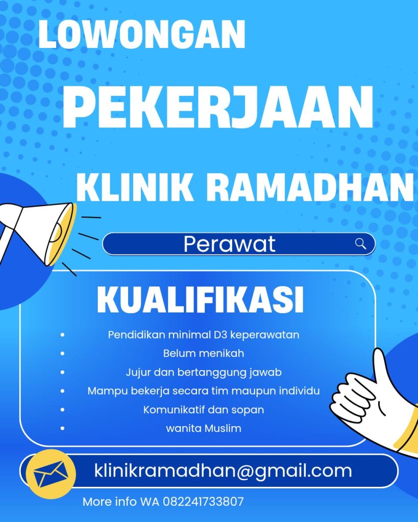 Kualifikasi : MInimal D3 Keperawatan, belum menikah, wanita muslim, mampu bekerja secara tim maupun individu, komunikatif dan sopan