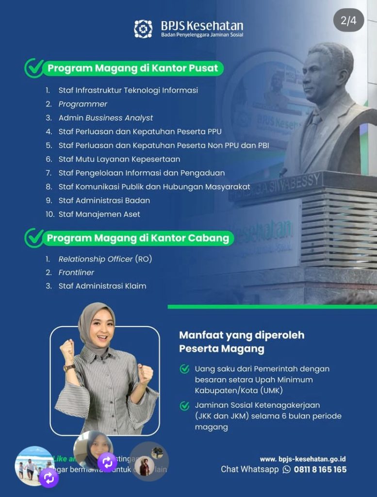Posisi : Staff Infrastruktur TI, programmer, Admin Bussines Analyst, Staff Administrasi, Staff Administrasi Klaim, Staff Mutu Layanan Kepesertaan