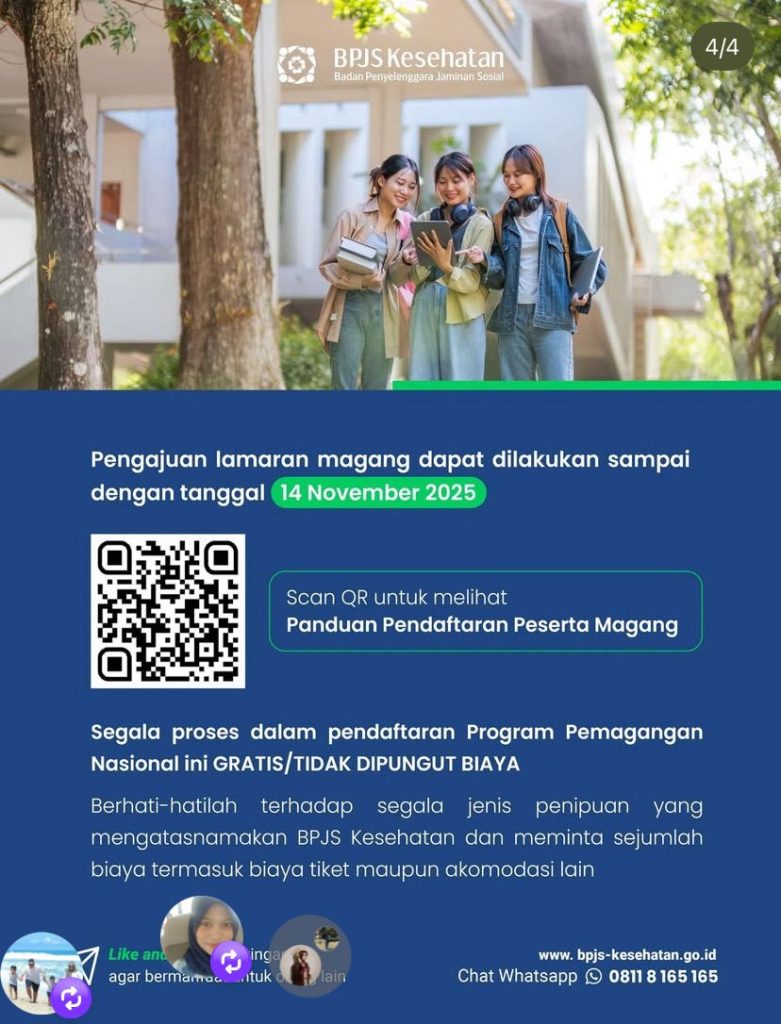 Manfaat yang diperoleh : Uang saku setara UMK Kota, Jaminan Sosial Ketenagakerjaan selama 6 bulan periode magang
