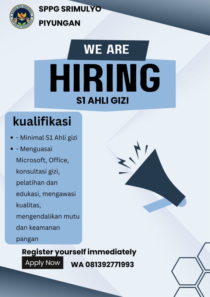 SPPG Srimulyo, Piyungan membuka kesempatan bagi Anda, lulusan S1 Ahli Gizi, untuk bergabung dan berkontribusi langsung dalam peningkatan kualitas gizi dan keamanan pangan masyarakat.