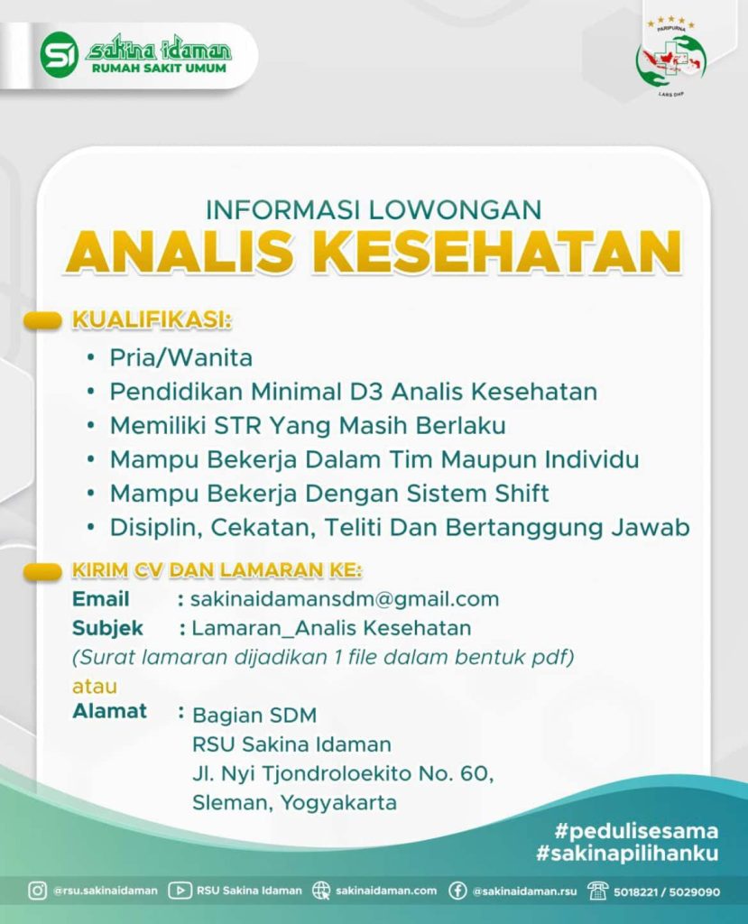 bagi alumni UNISA Yogyakarta yang berminat bisa mengirimkan CV terbaik ke email : sakinaidamansdm@gmail.com dengan subjek : Lamaran_Analis Kesehatan