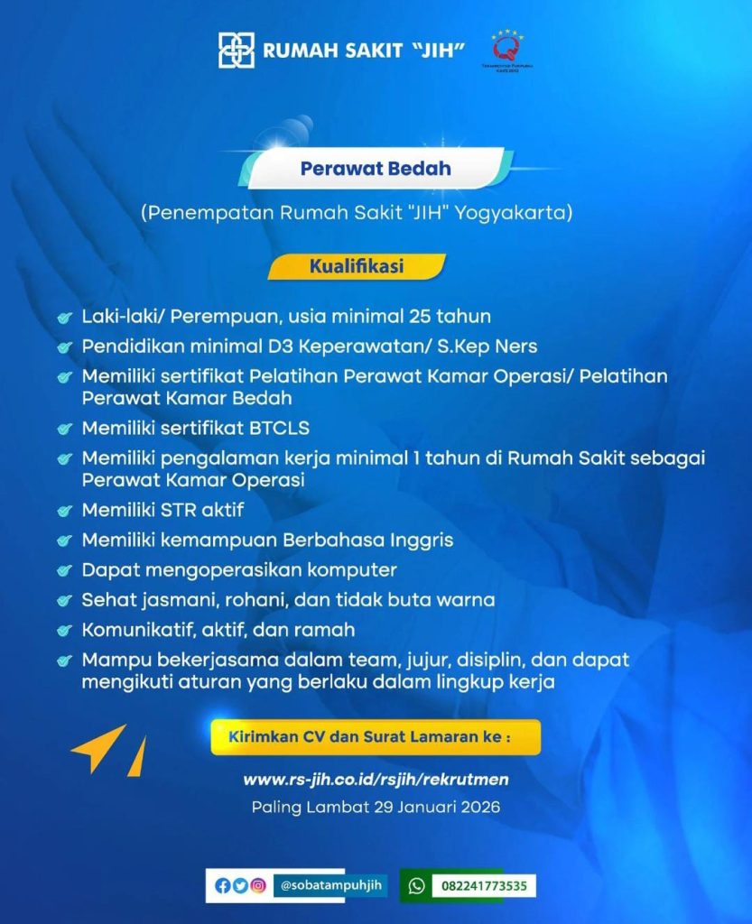 Kualifikasi : Laki – Laki / Perempuan minimal 25 tahun, pendidikan minimal D3 Keperawatan / S.Kep Ners, memiliki sertifikat pelatihan perawat kamar operasi /Pelatihan Perawat kamar bedah, memiliki sertifikat BTCLS, memiliki pengalaman kerja minimal 1tahun, STR aktif, dapat mengoperasikan komputer dan memiliki kemampuan bahasa Inggris