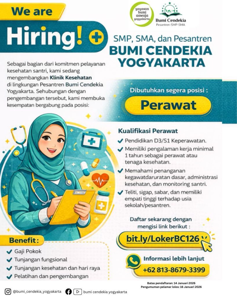 Kualifikasi : Pendidikan D3/SI Keperawatan, memiliki pengalaman kerja minimal 1 tahun, memahami penanganan kegawatdaruratan dasar, administrasi kesehatan dan monitoring santri