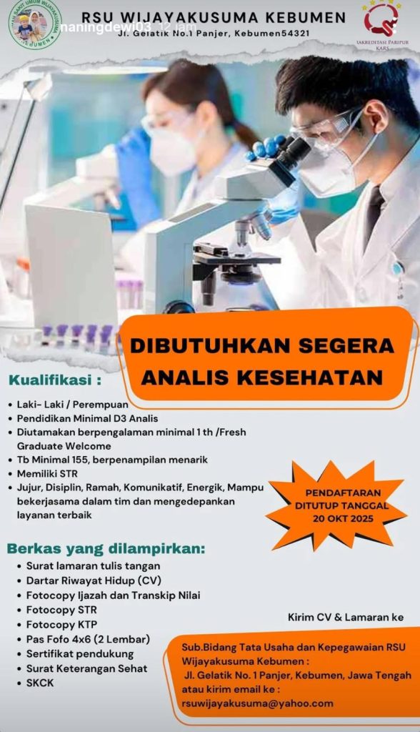 Kualifikasi : laki – laki /Perempuan, Pendidikan minimal D3 Analis, memiliki STR