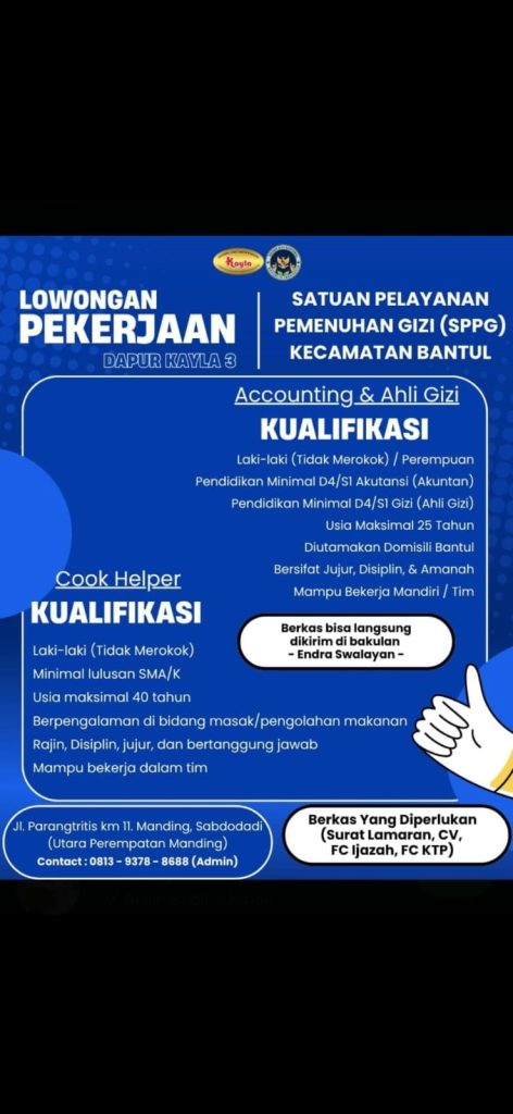 Posisi yang dibutuhkan : Acounting, Ahli Gizi, Cook Helper